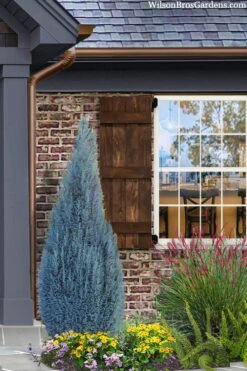 Growing 6 to 8 feet tall and 2 to 2.5 feet wide over time, the Blue Surprise Lawson Cypress is ideal for use as vertical accent or focal point specimen in smaller garden spaces. It is excellent for use as an accent or to frame an entrance in home foundation plantings. Where space allows, spaced groupings of three are nice. Also a fine solo or centerpiece in containers combined with other plants that like sun and a well-drained soil. A fine addition to rock gardens, conifer gardens, blue theme gardens and Asian or Zen gardens.